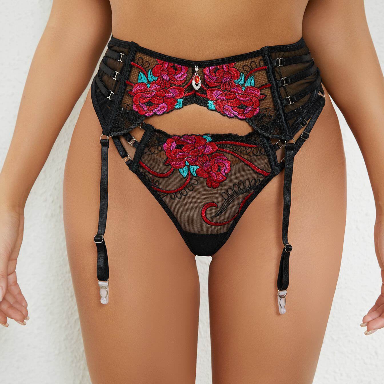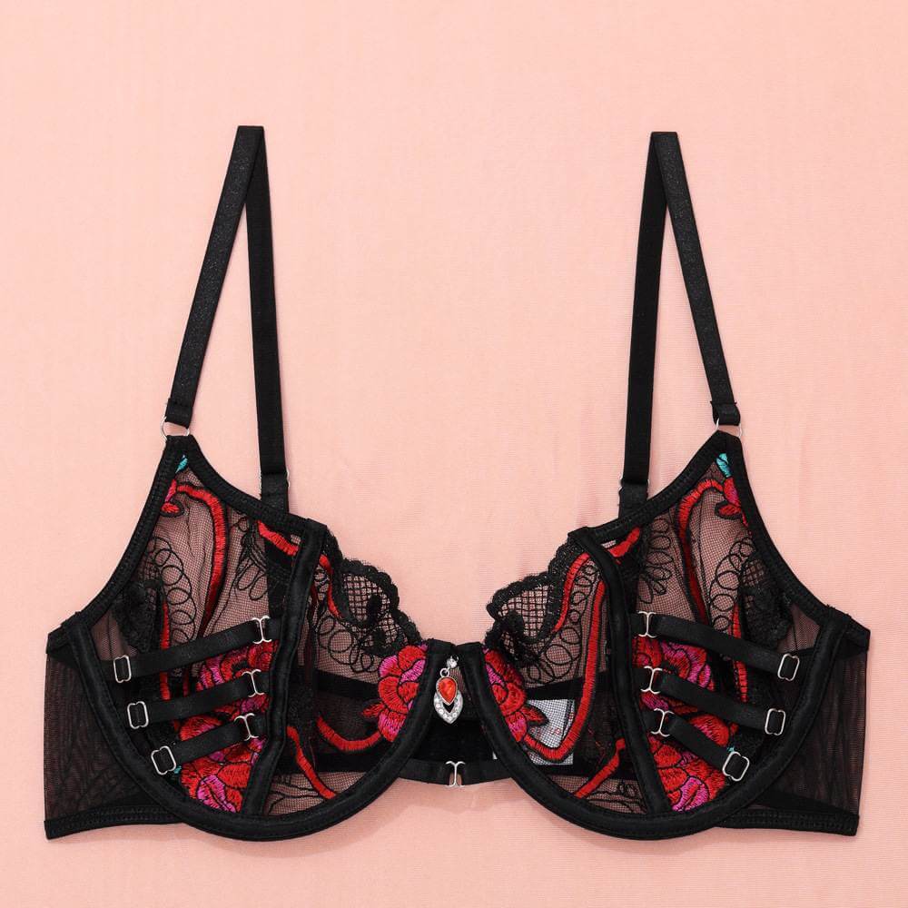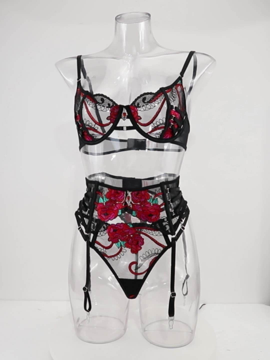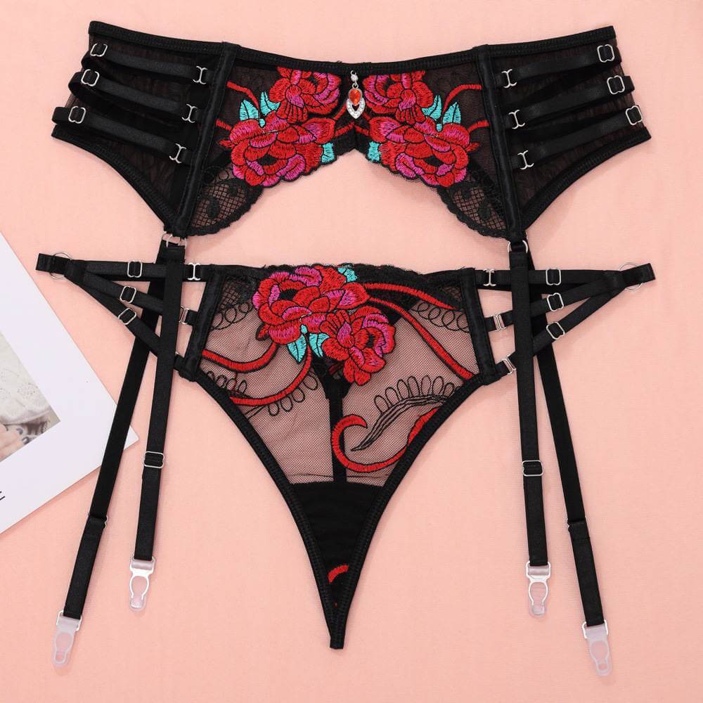 新款欧美系性感黑红色情趣内衣蕾丝玫瑰刺绣套装